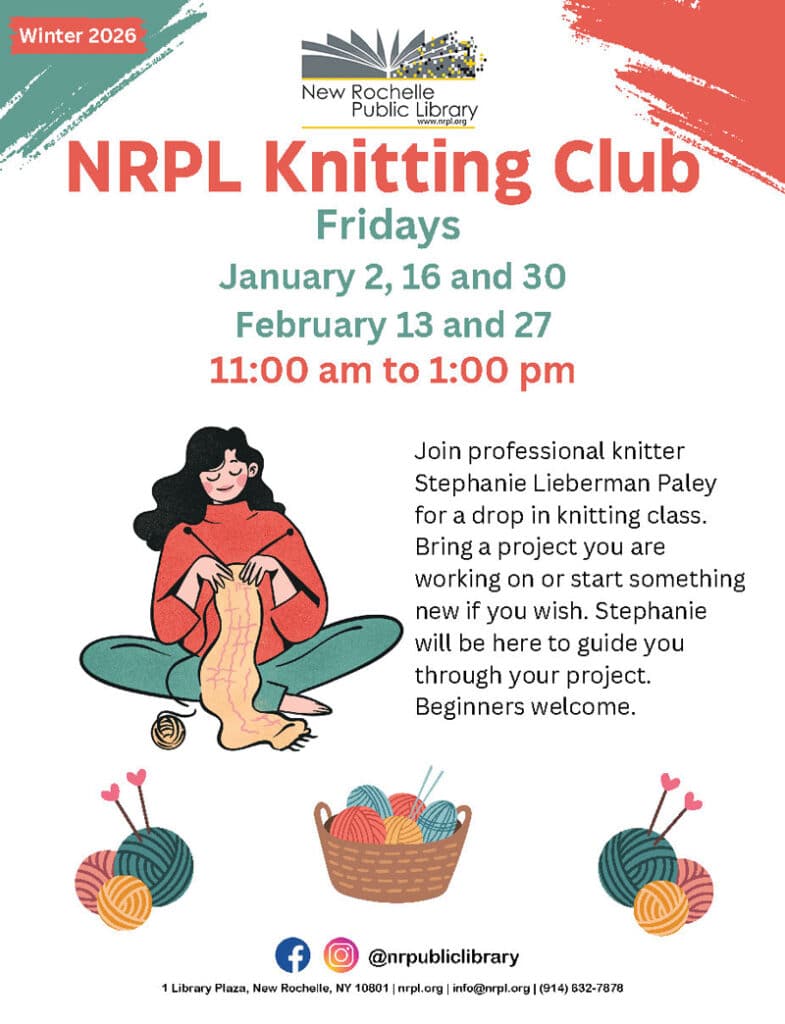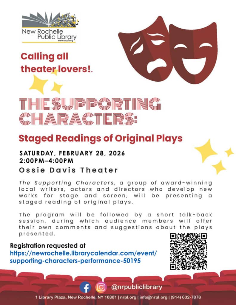 A group of award-winning local writers, actors, and directors present staged readings of original plays followed by a Q&A session. Registration requested at newrochelle.librarycalendar.com.